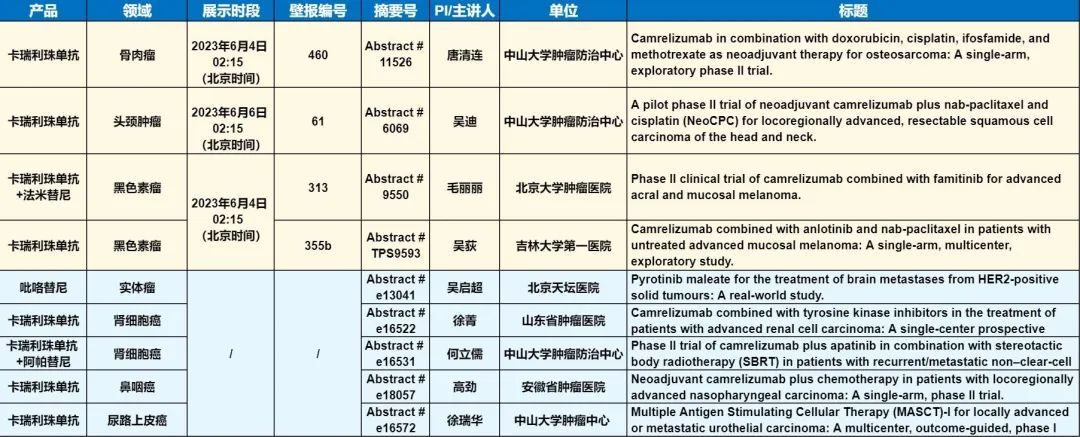 此外,在头颈肿瘤、黑色素瘤、骨肉瘤、鼻咽癌、肾细胞癌、尿路上皮癌等多个领域,卡瑞利珠单抗、吡咯替尼等产品相关研究一共入选了4项壁报展示和5项线上发表,彰显了AG官网医药强大的自主研发综合实力。